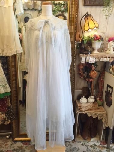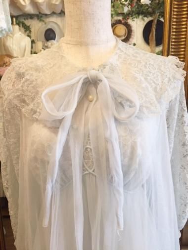 アメリカヴィンテージの襟+袖レース切替ブルーロングシフォンガウンになります。