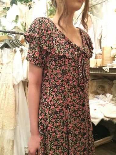 vintage U.S.A. ホワイトカラーリボン付きフローラルブラックワンピース