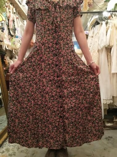 vintage U.S.A. 裾ラッフルフローラルコットンブラックワンピース