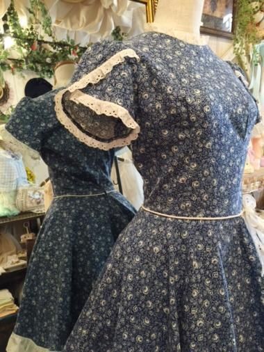 ネイビーにうっすら浮かぶ小さなバラのプリントが綺麗なワンピースです。