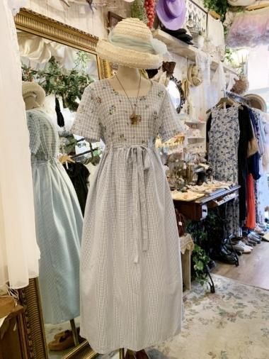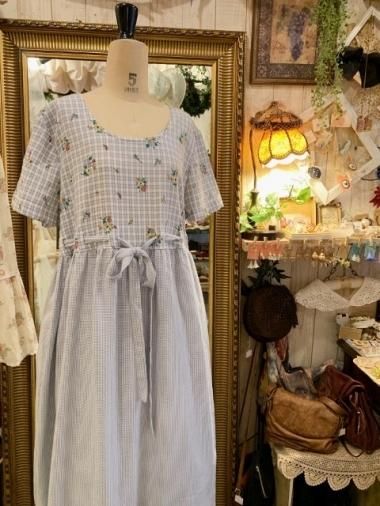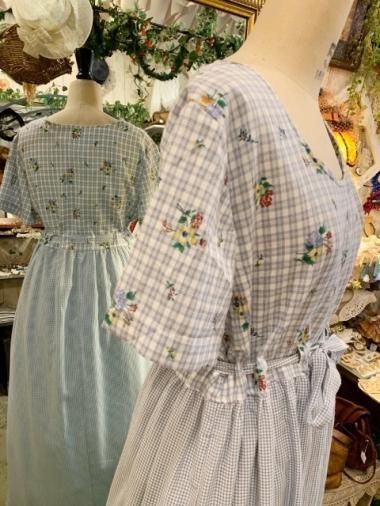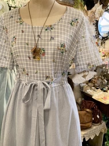 ビンテージ チェック柄×花柄とろみワンピース sd972
