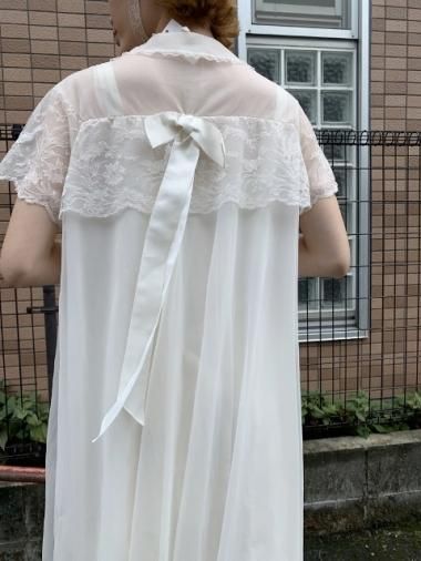 vintage nightie 60s リボンレースロマンチックロングガウン オフホワイト