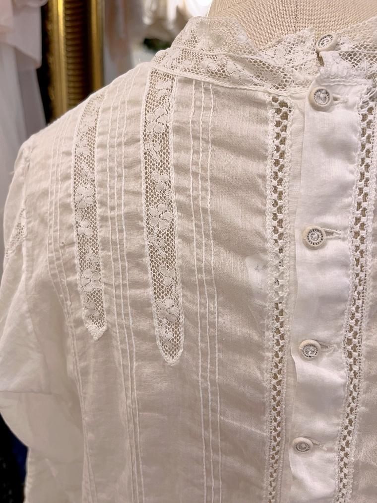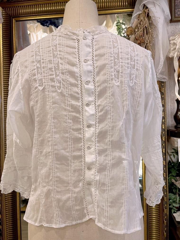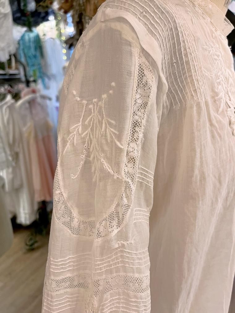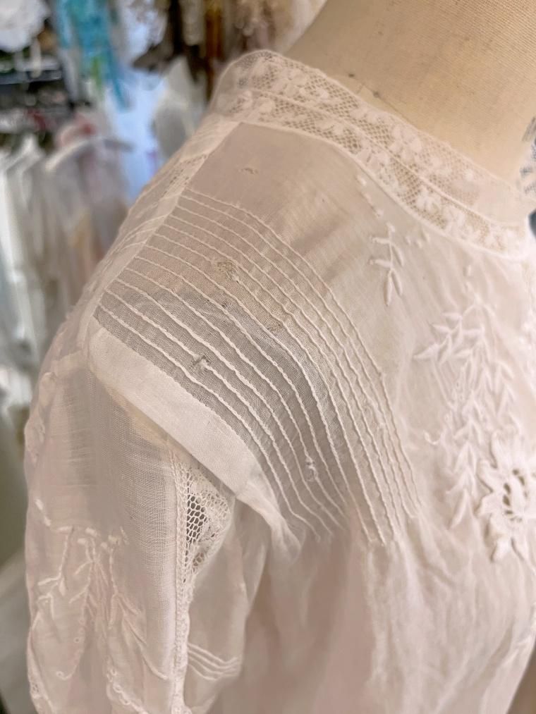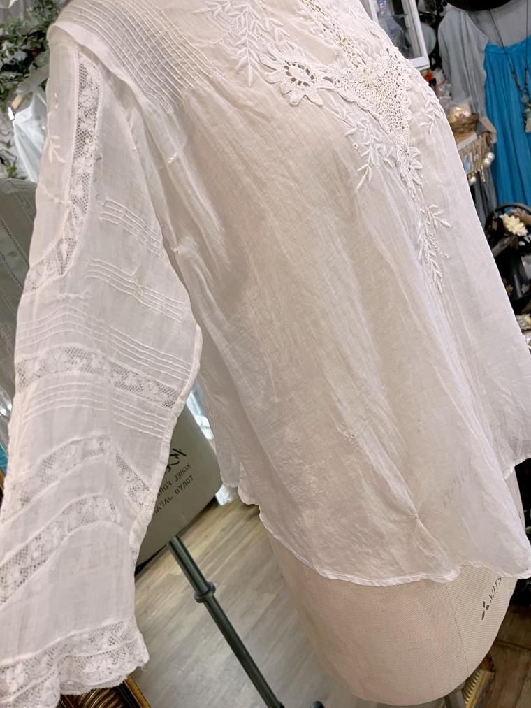 antique フロントフラワー刺繍コットンホワイトアンティークブラウス us0681