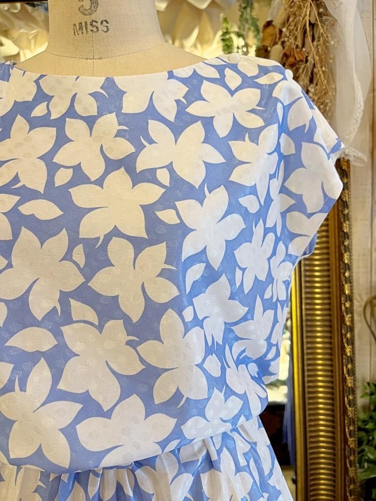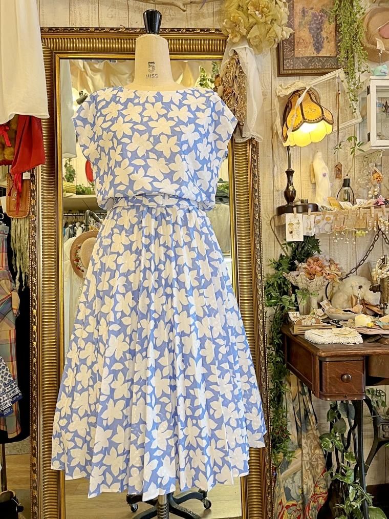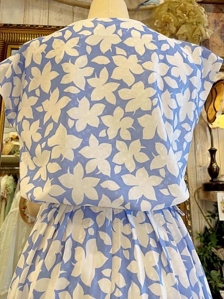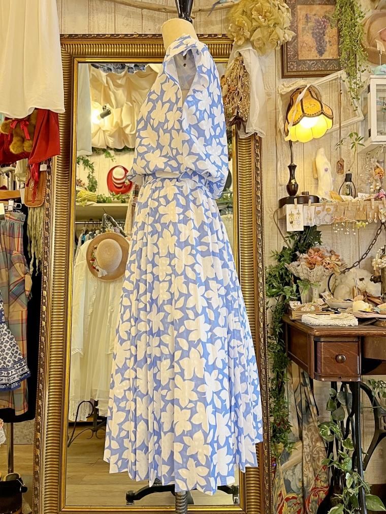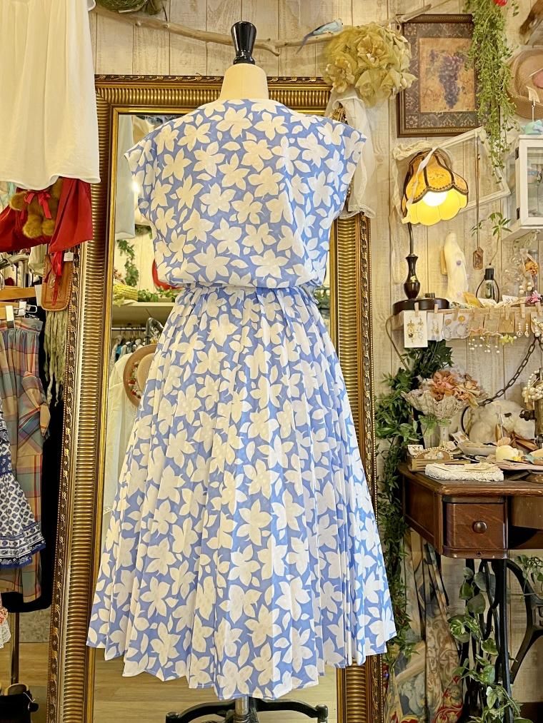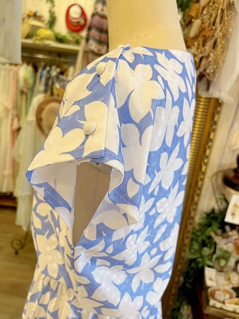 淡いブルー地に白い花柄が涼し気な印象のワンピースです。