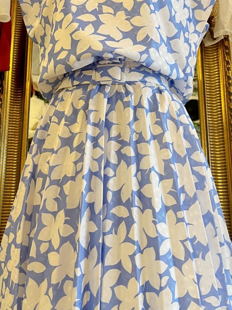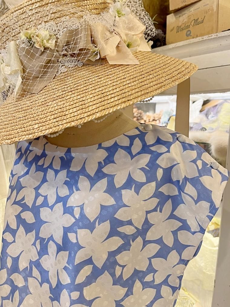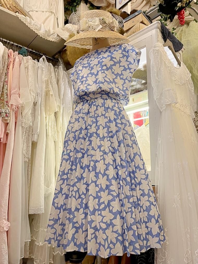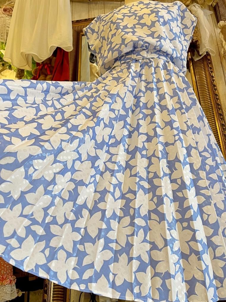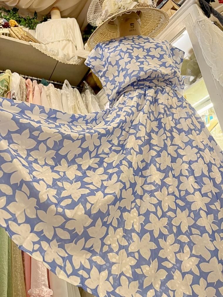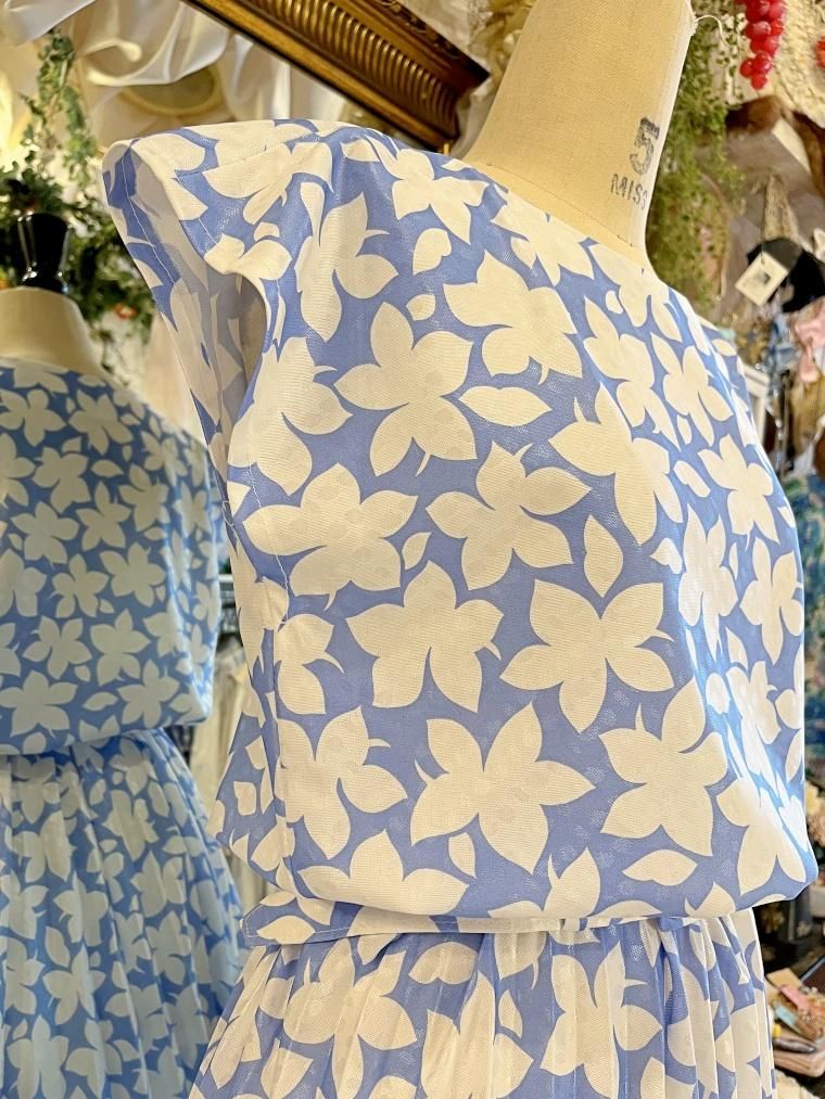淡いブルー地に白い花柄が涼し気な印象のワンピースです。