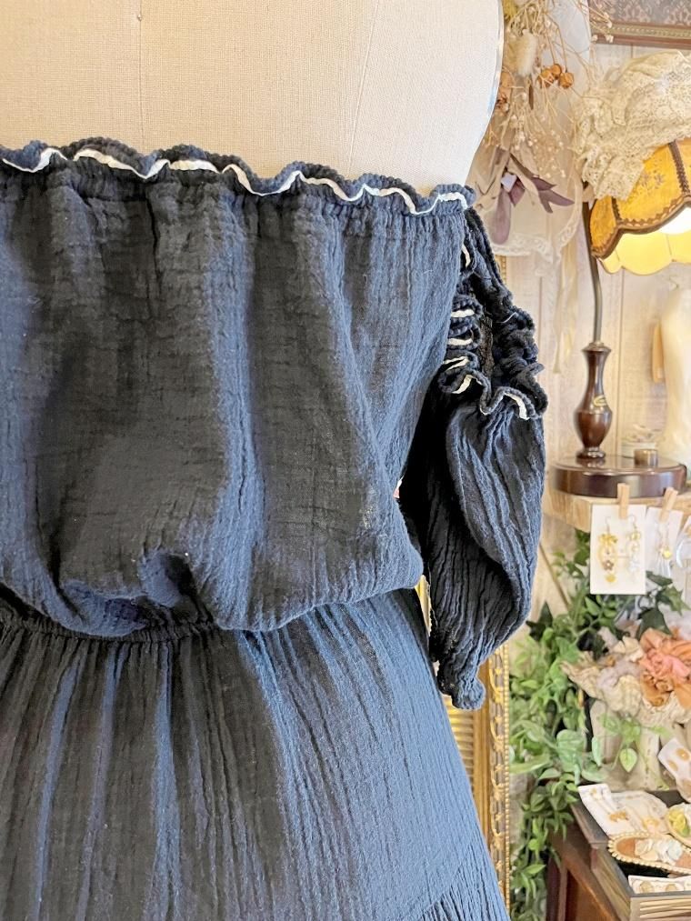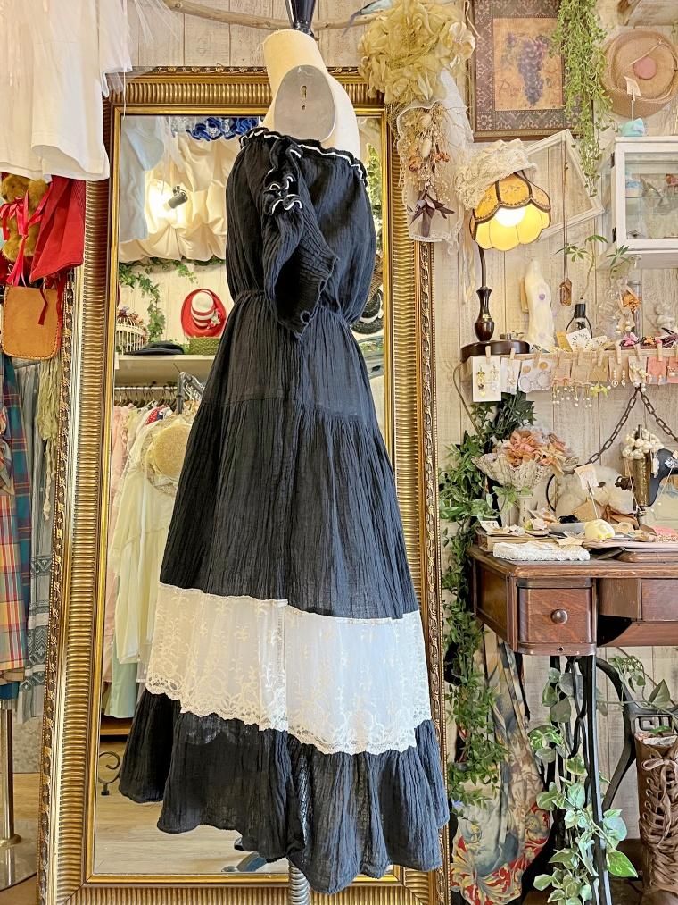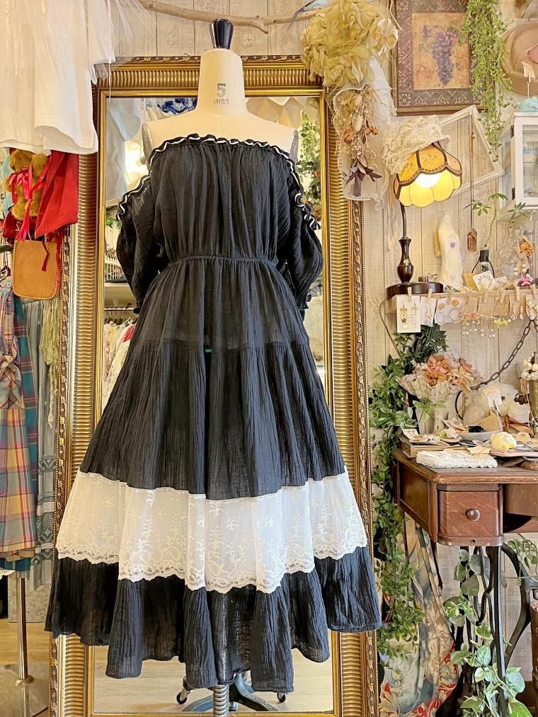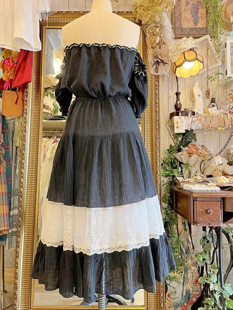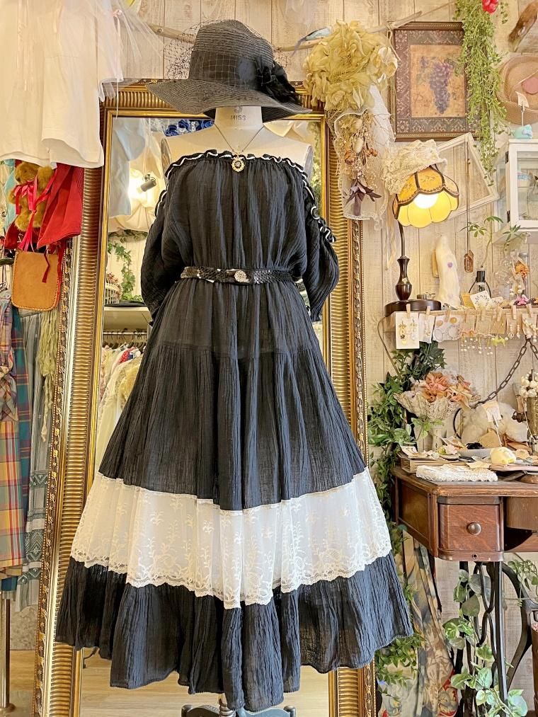 Vintage レース切り替えオフショルブラックワンピース 23kk085