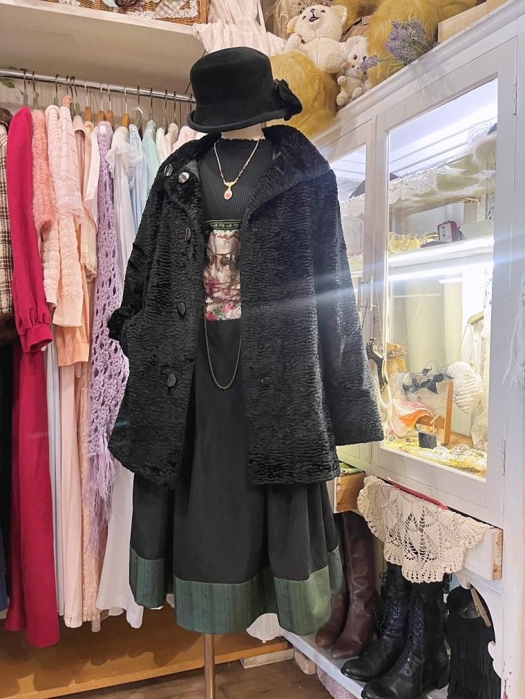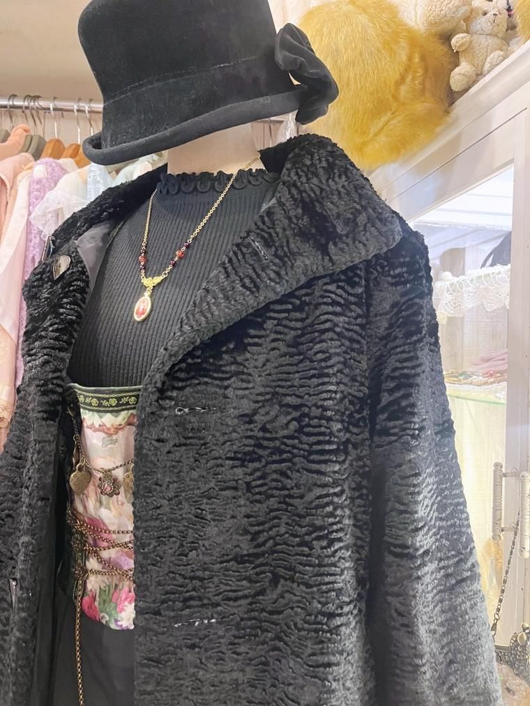 Vintage スタンドカラーフェイクファーブラックコート 23693