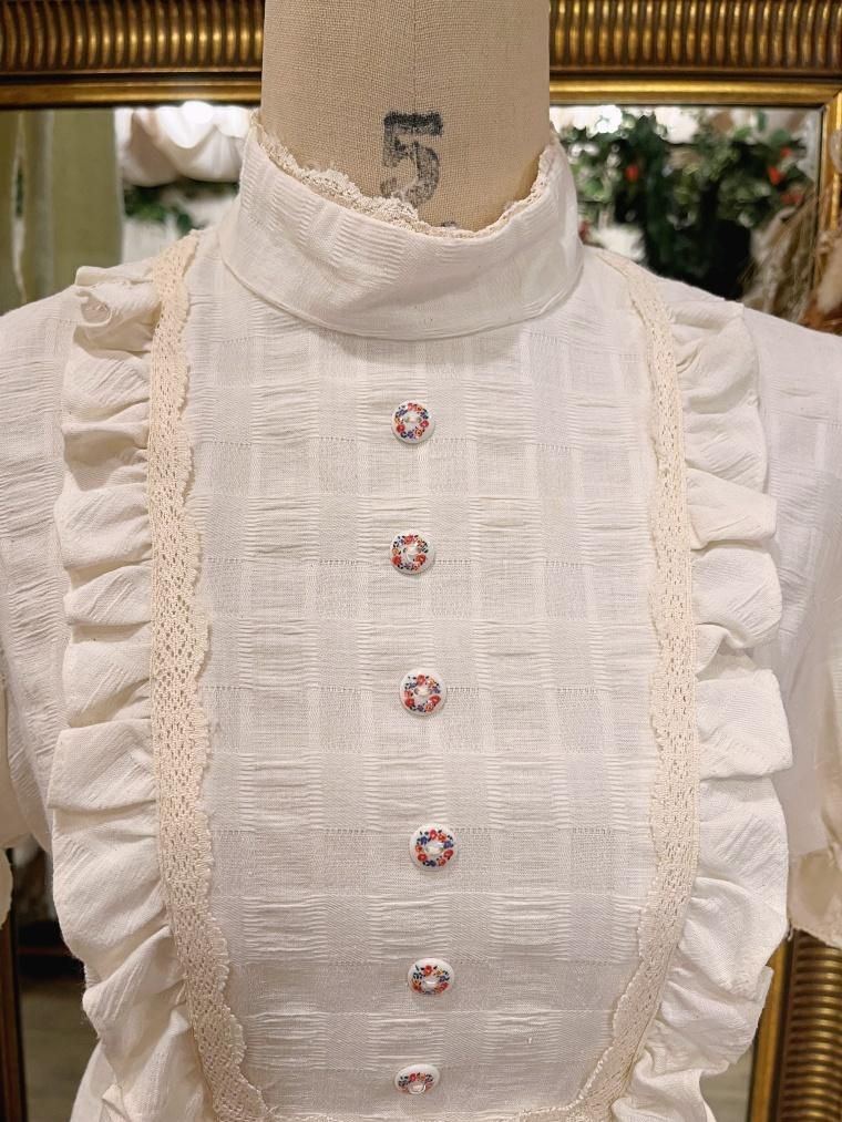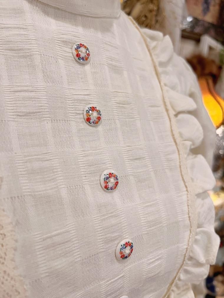 フリルで囲われた胸もとに飾りボタンが装飾された