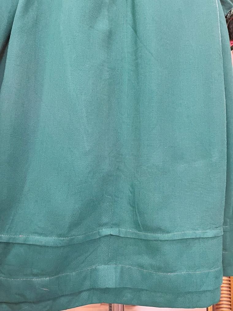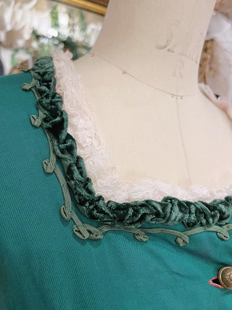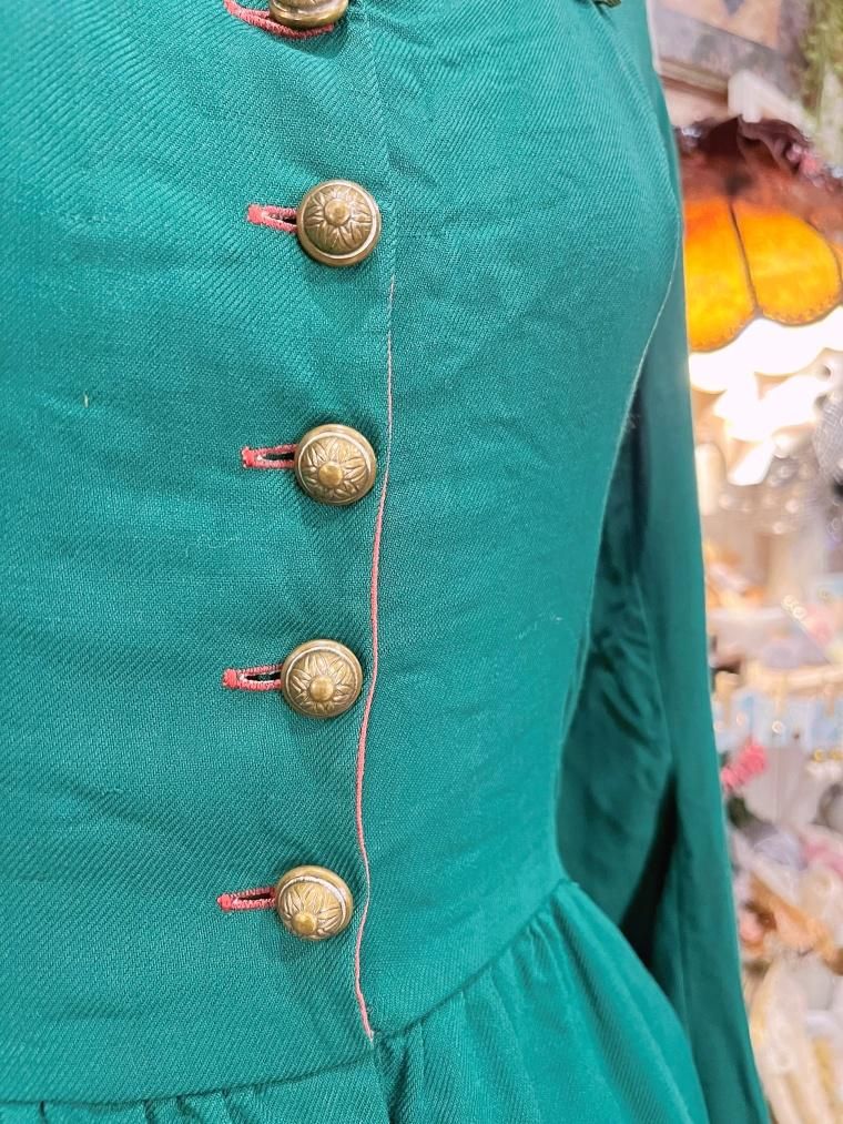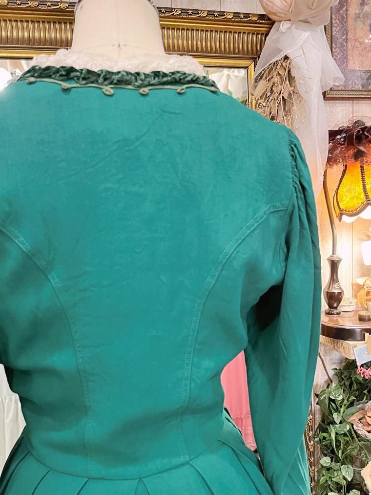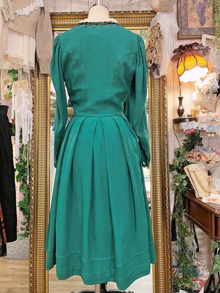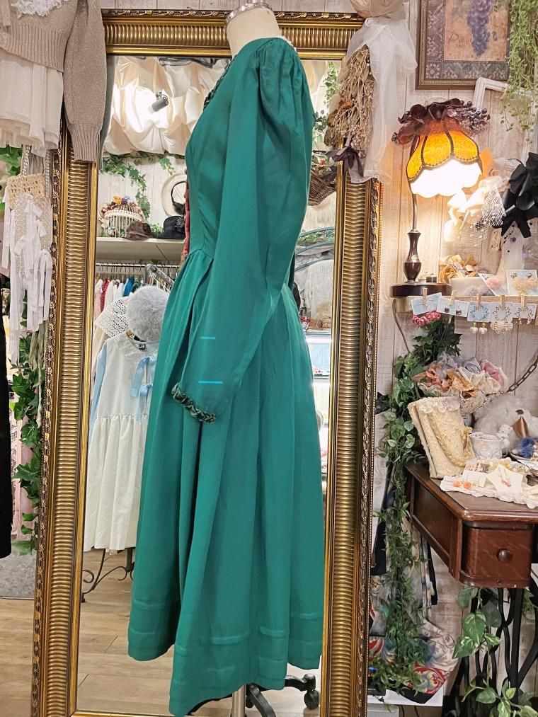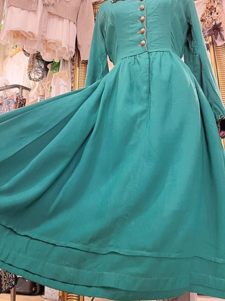 深いグリーンが目を惹くミディアム丈のワンピースです。