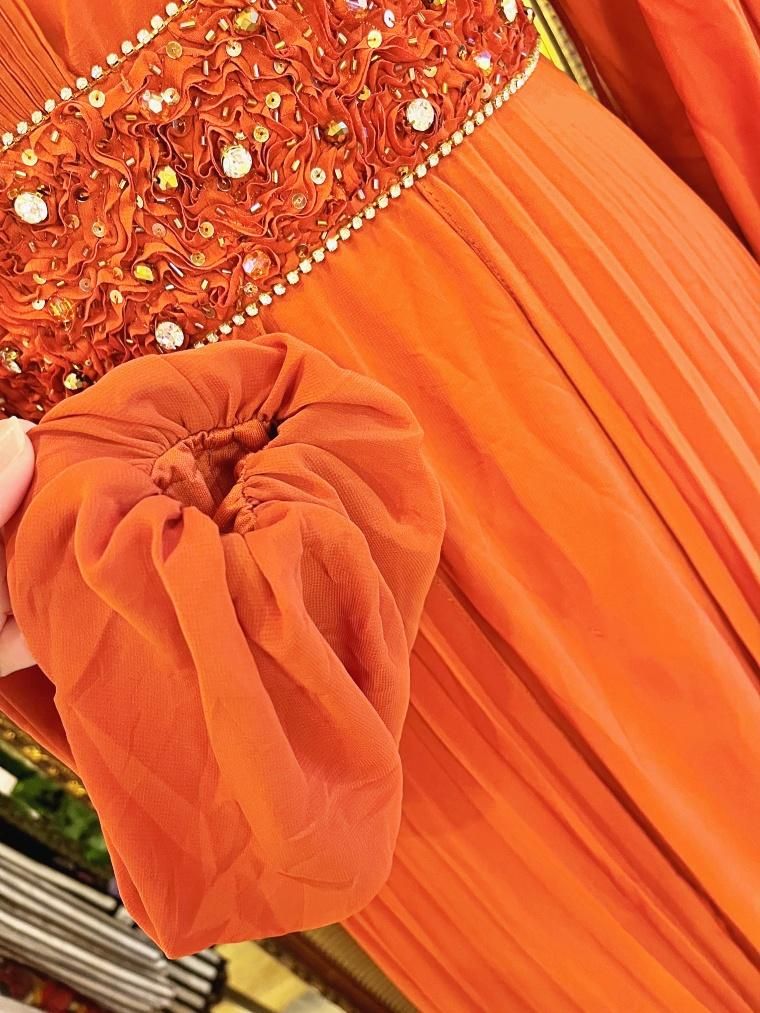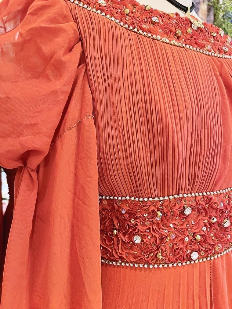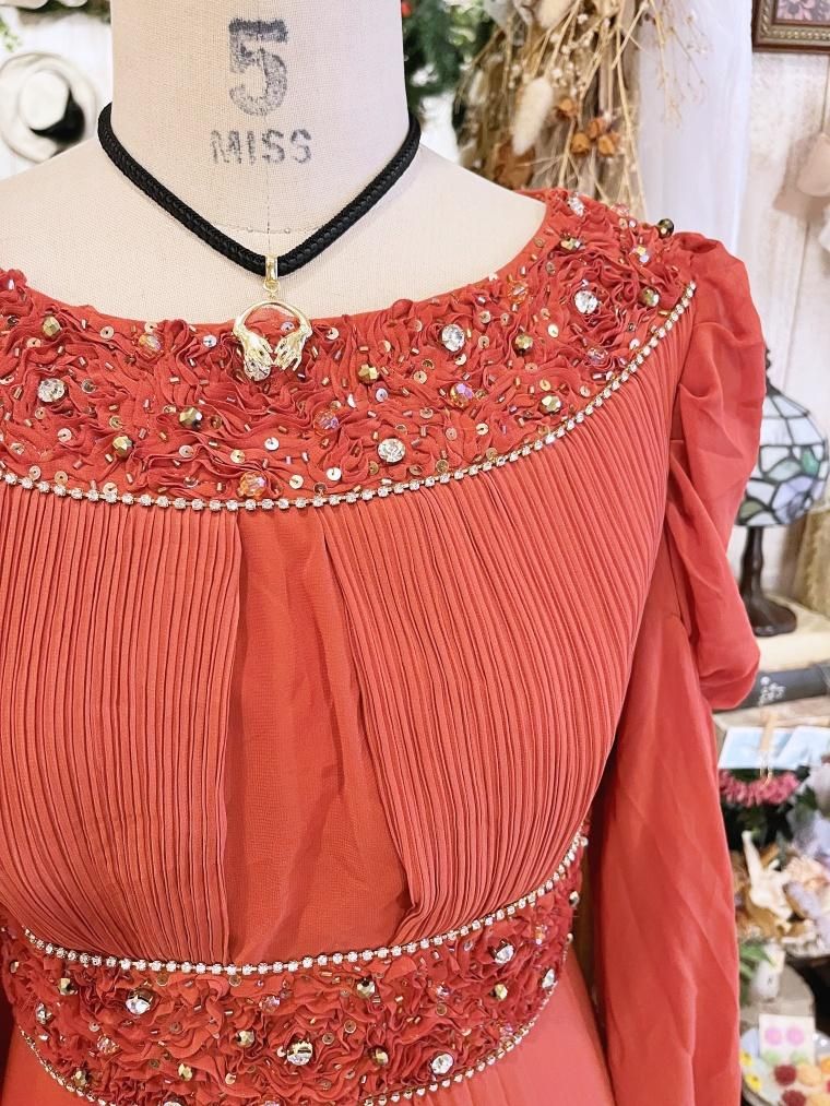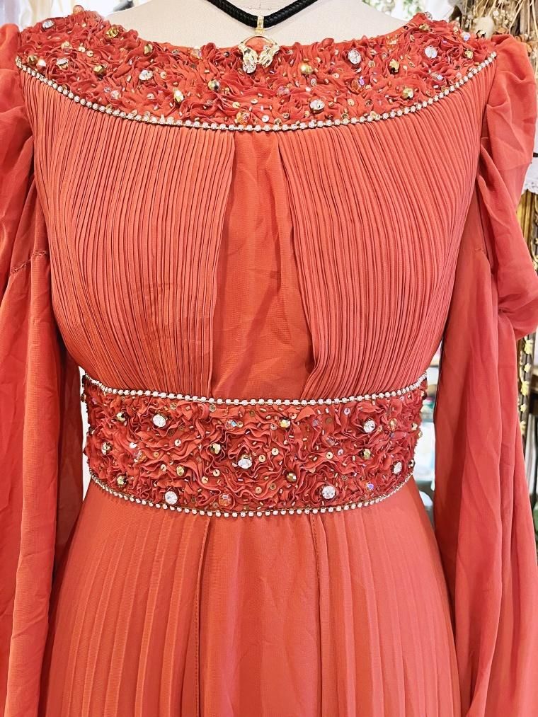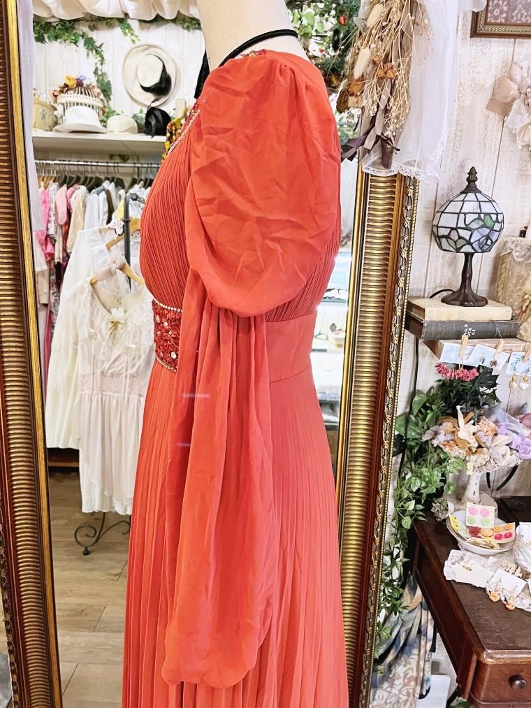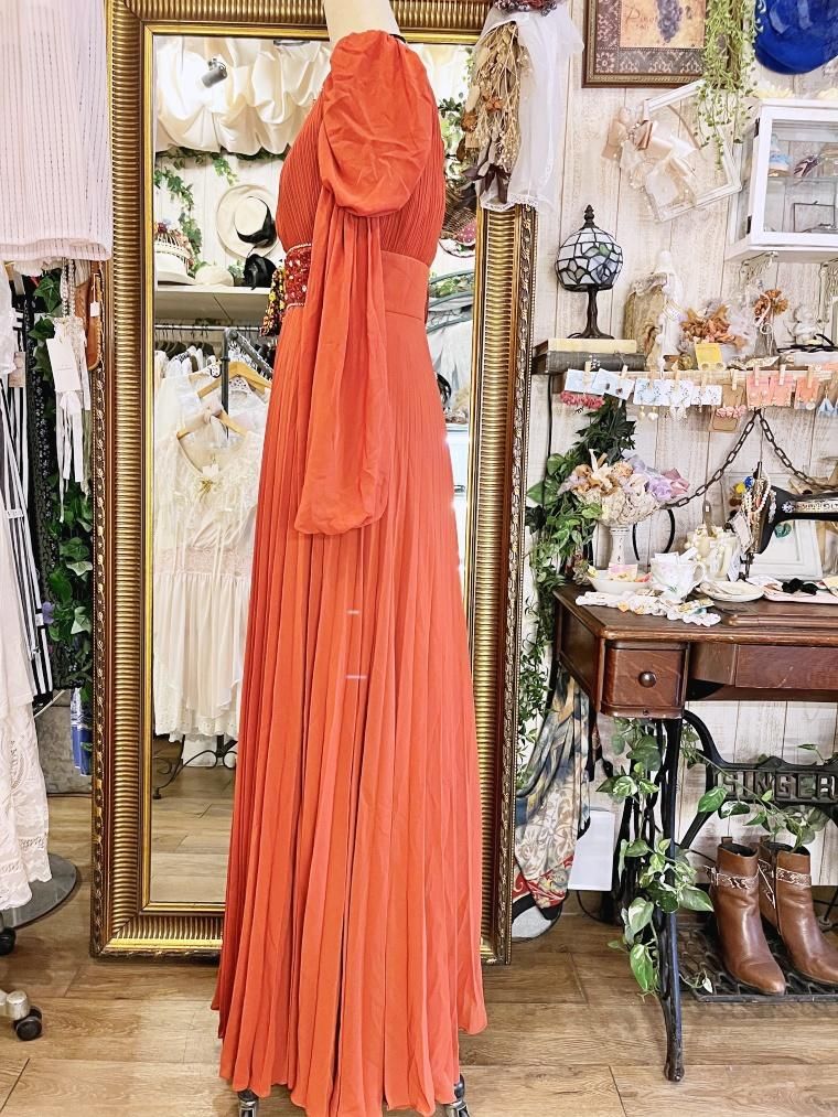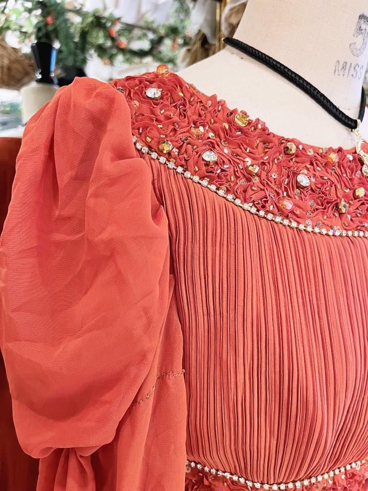 Vintage ビジュー付きパフスリーブシフォンフルレングスドレス 24005