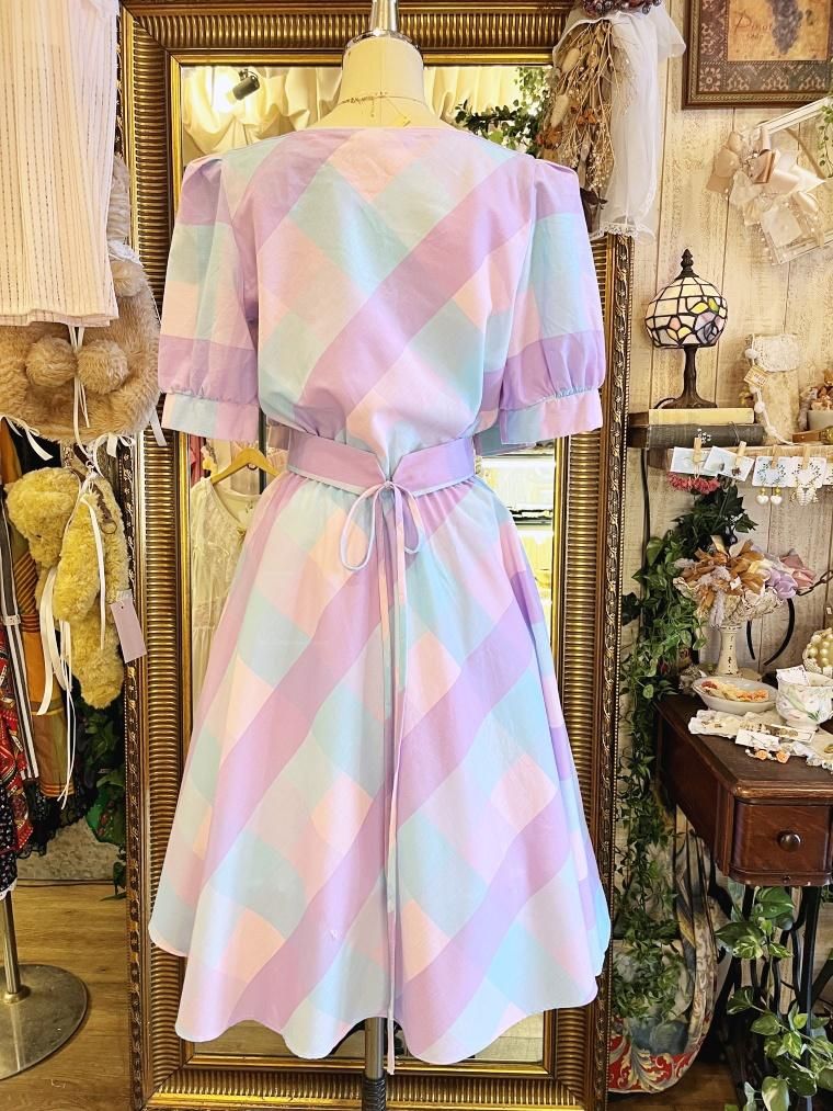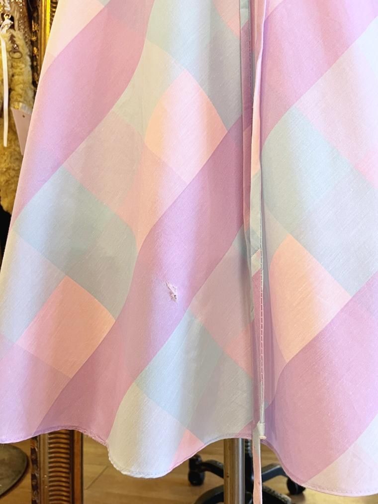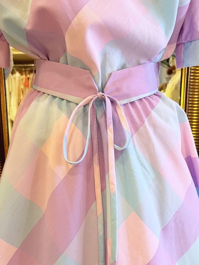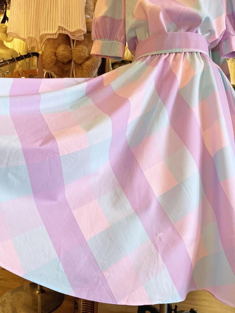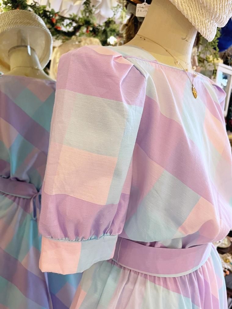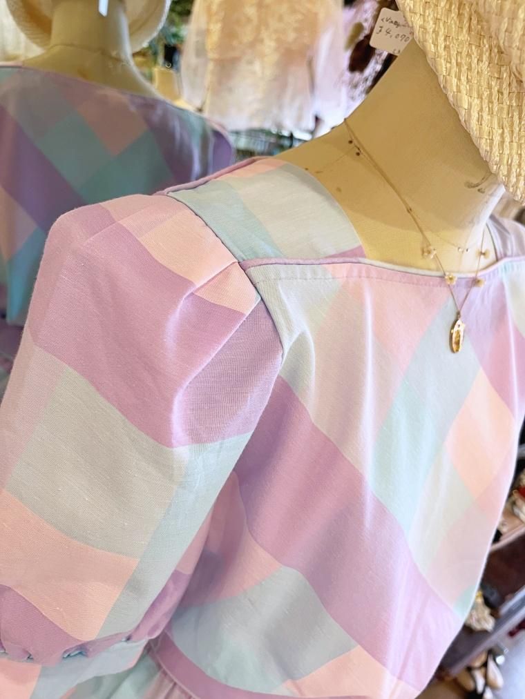 Vintage ブロックチェックパステルカラーコットンワンピース 24022