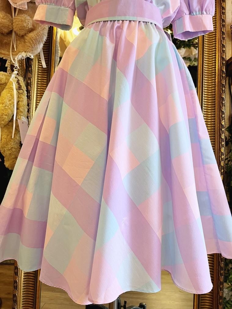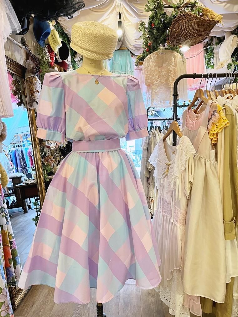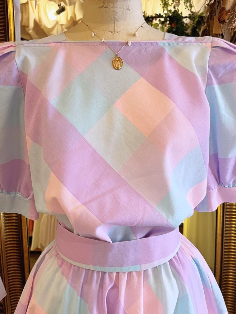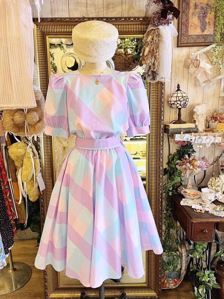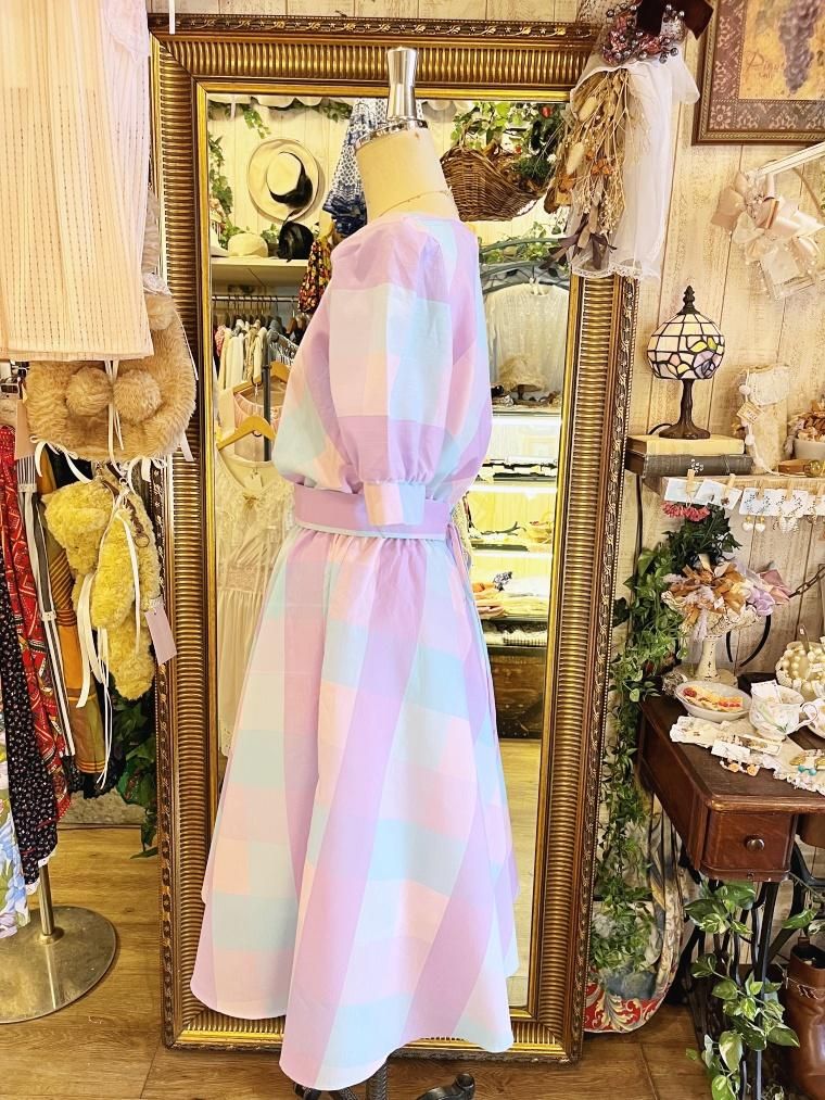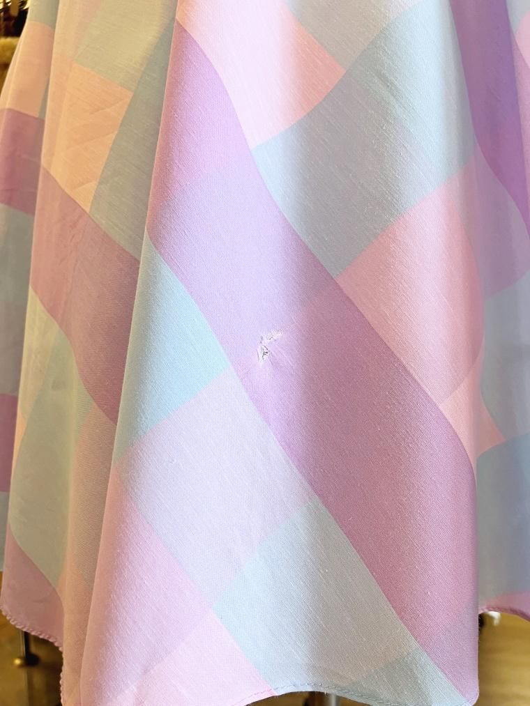 Vintage ブロックチェックパステルカラーコットンワンピース 24022