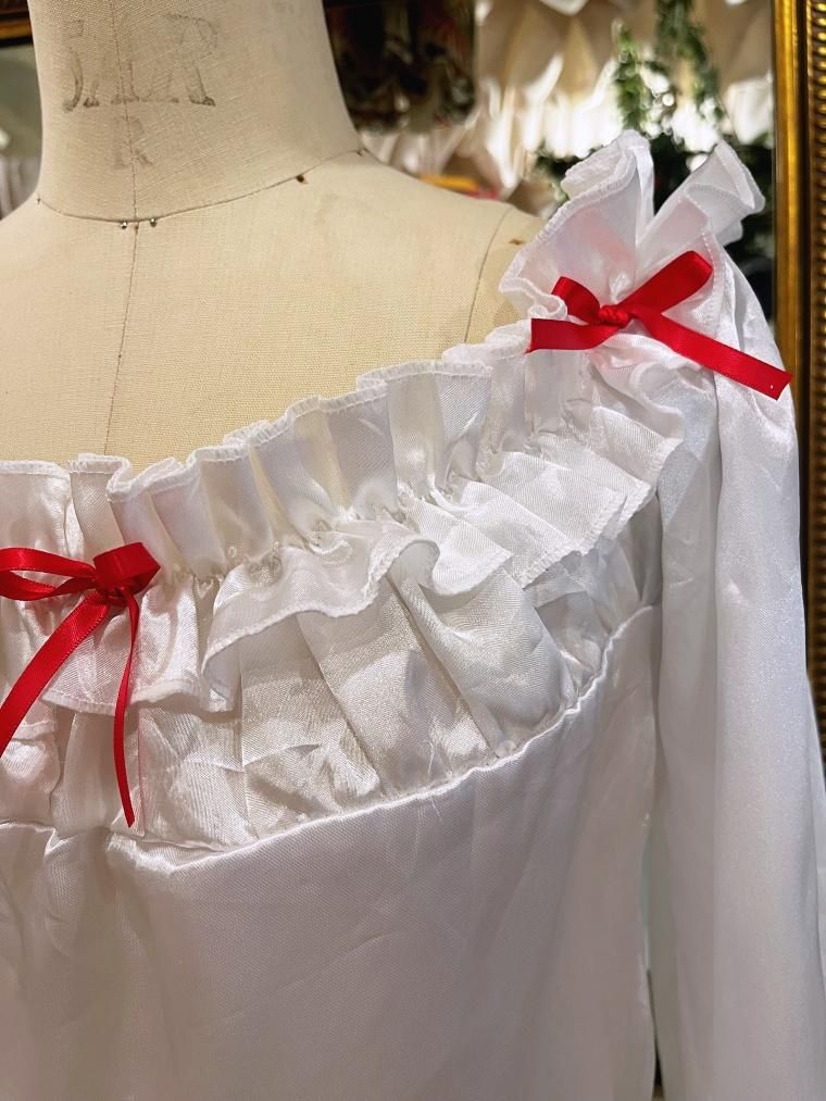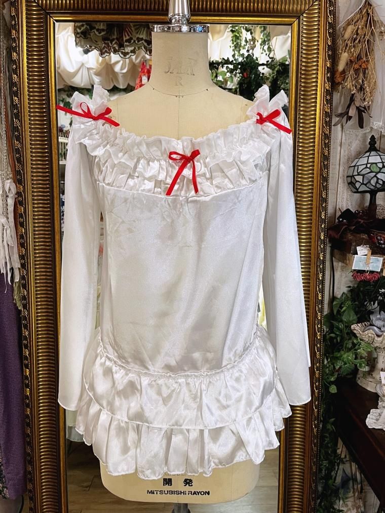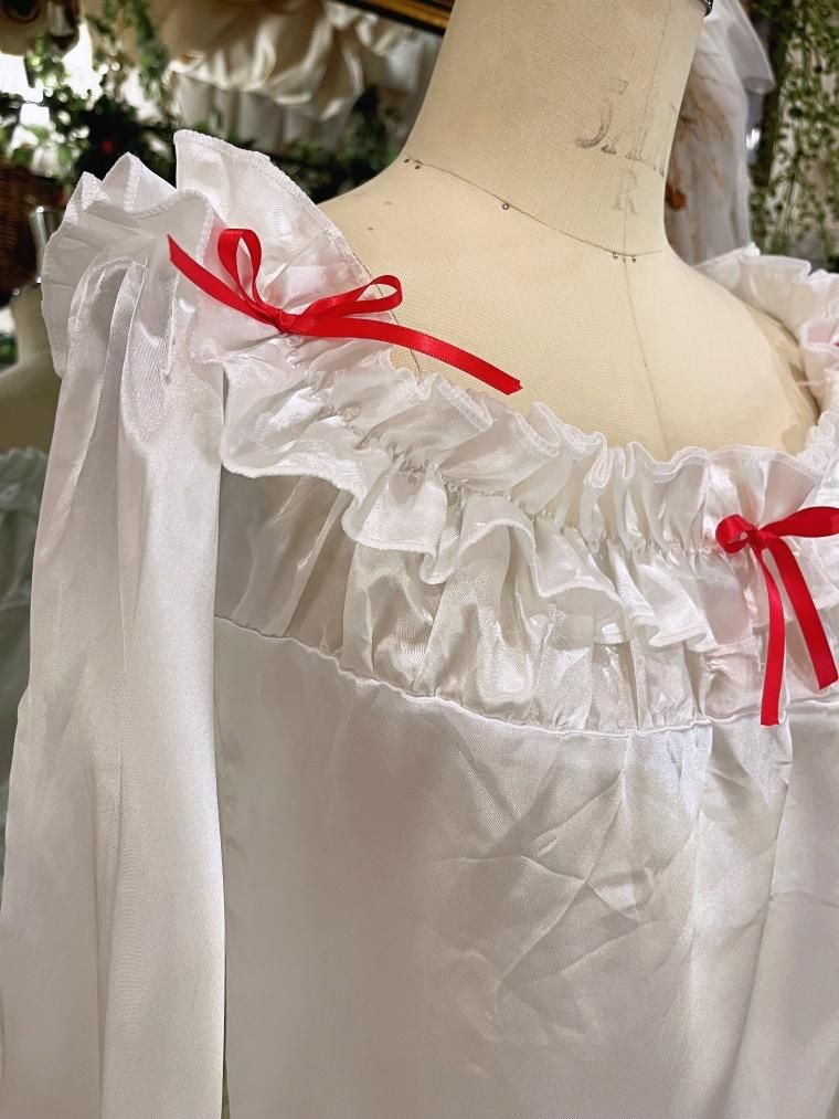 襟もとに赤いリボンが装飾されたかわいいデザインです。