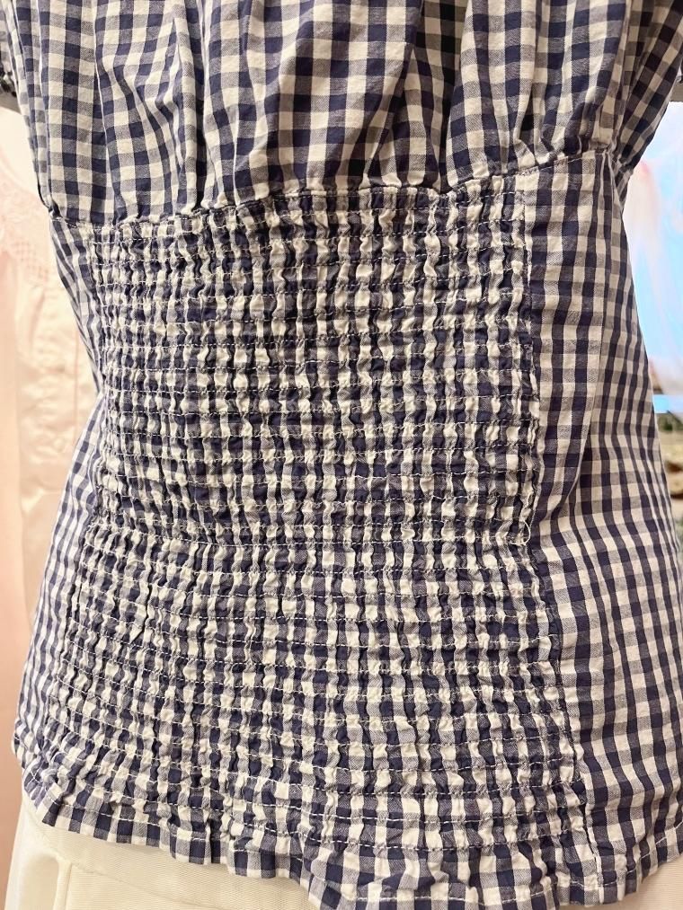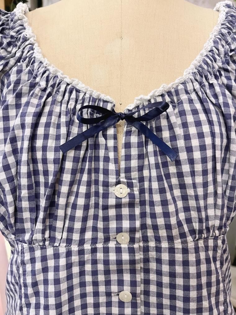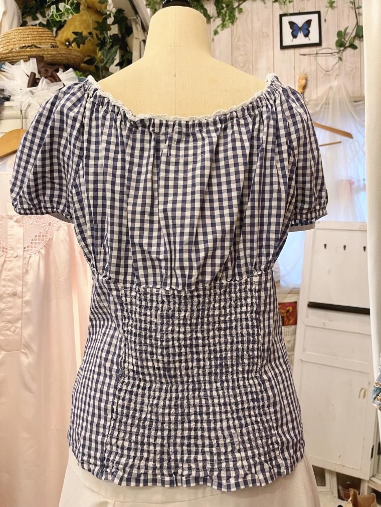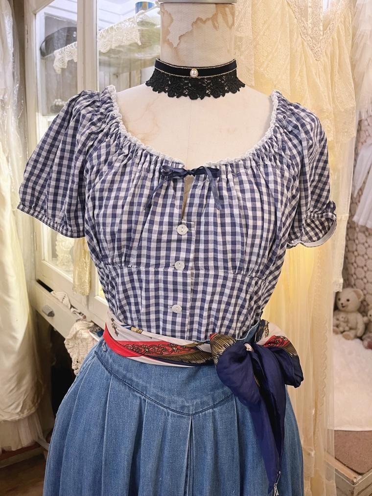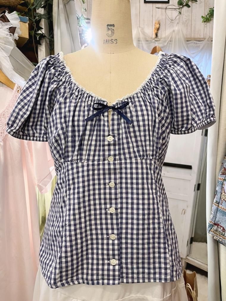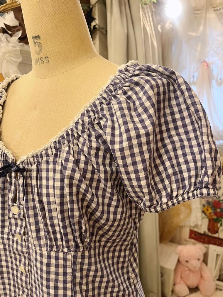 Used ギンガムチェックパフスリーブブラウス ネイビー 24757