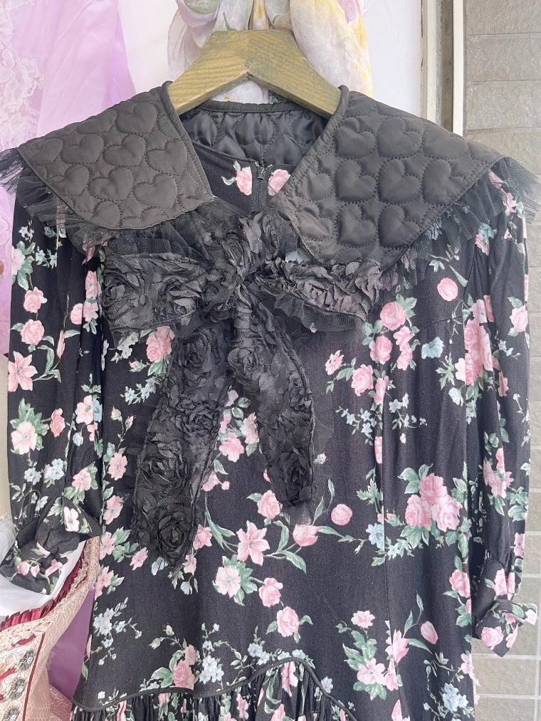 vintage U.S.A. ホワイトカラーリボン付きフローラルブラックワンピース
