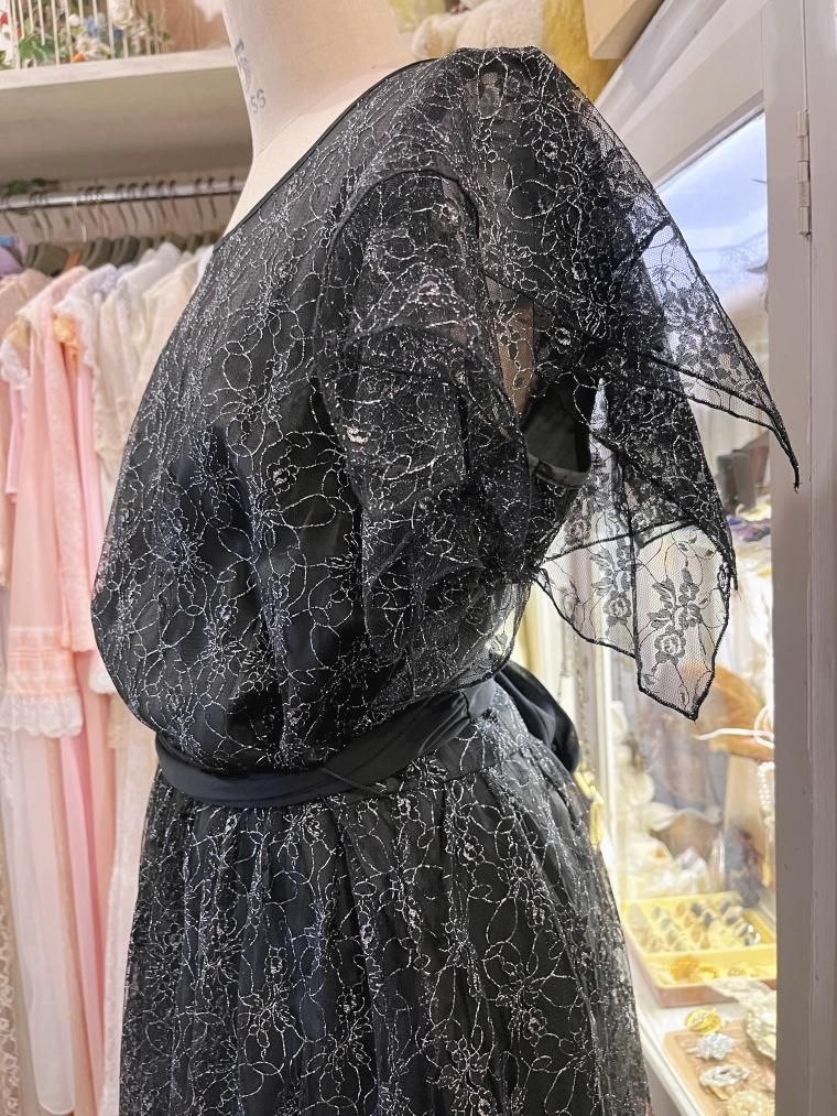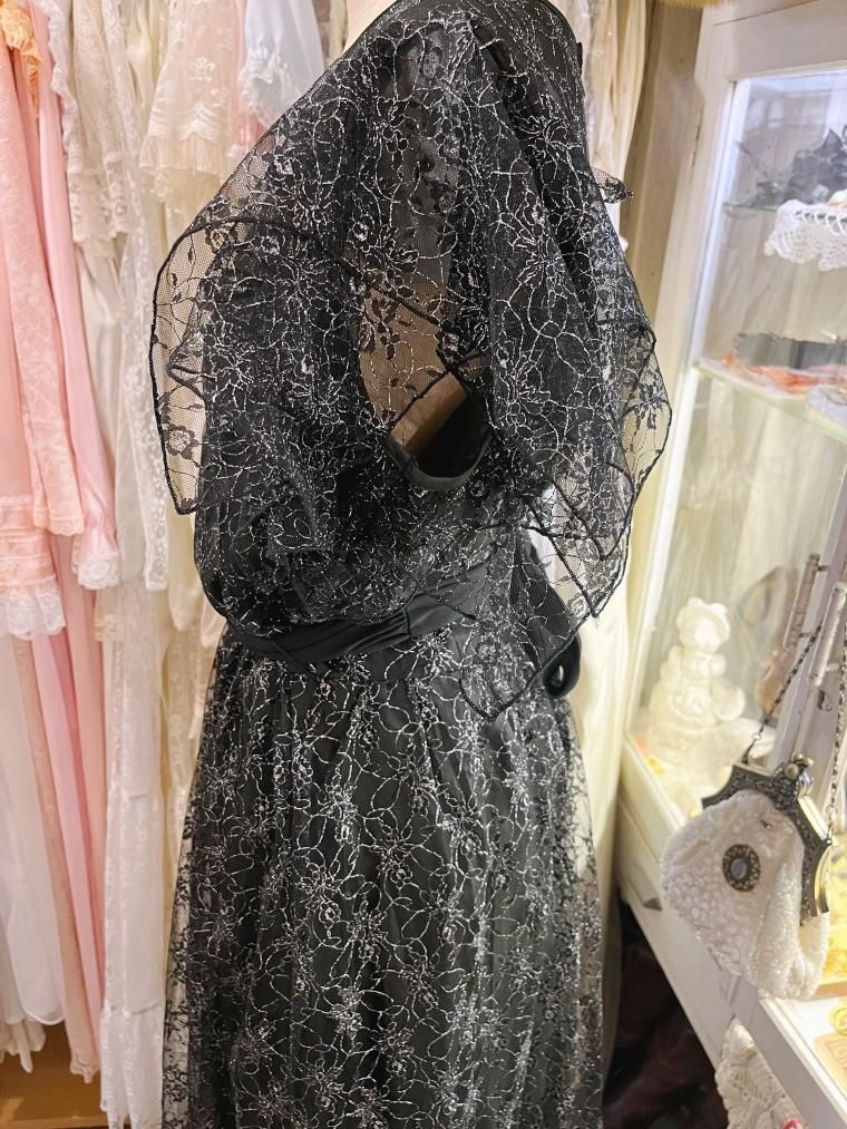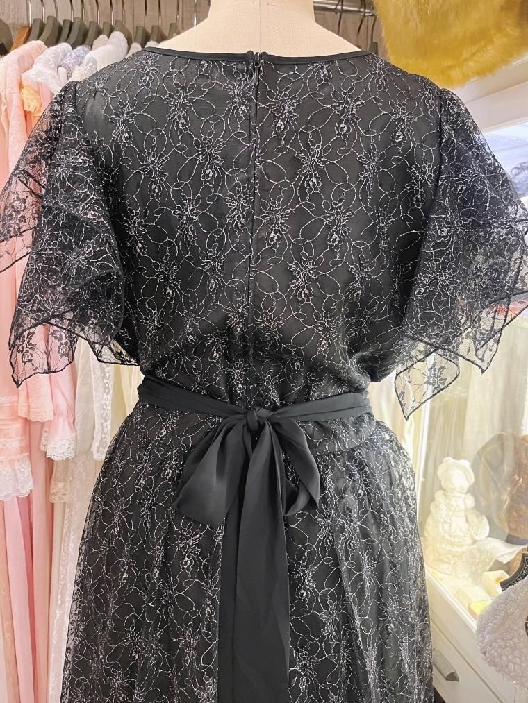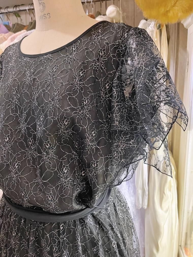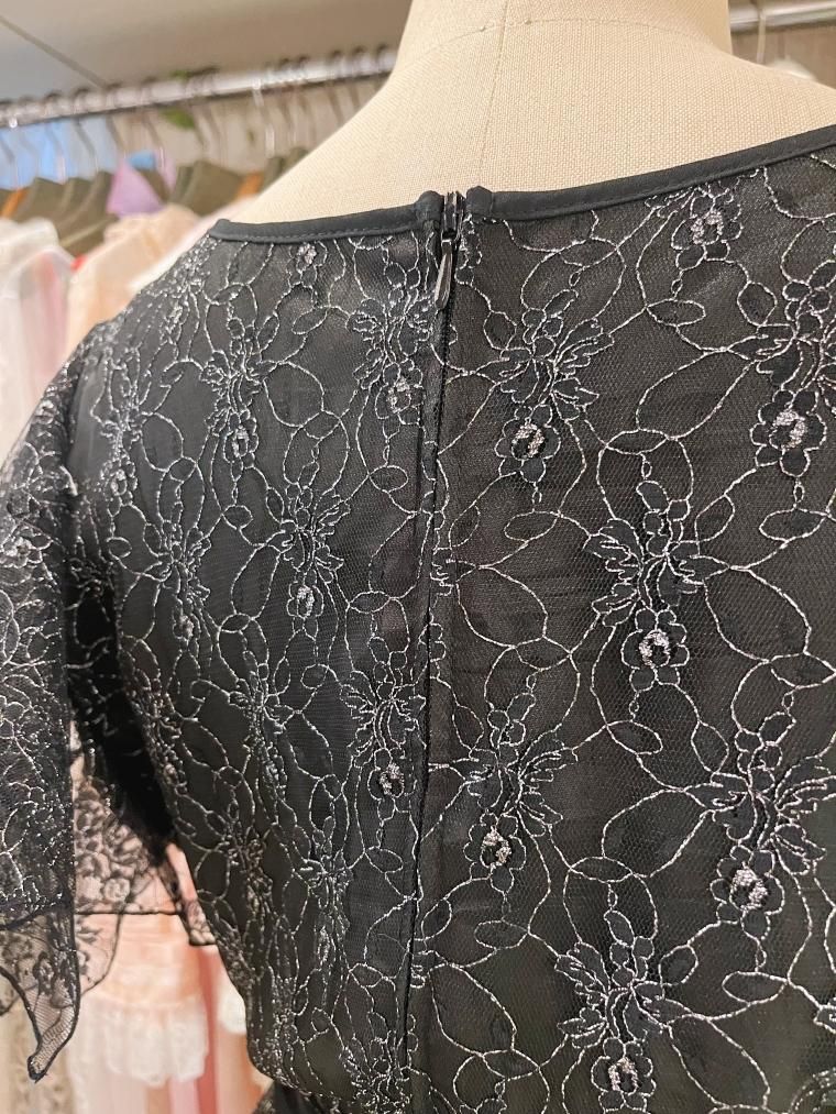 総レースフレアスリーブラメ入りブラックワンピース 25424
