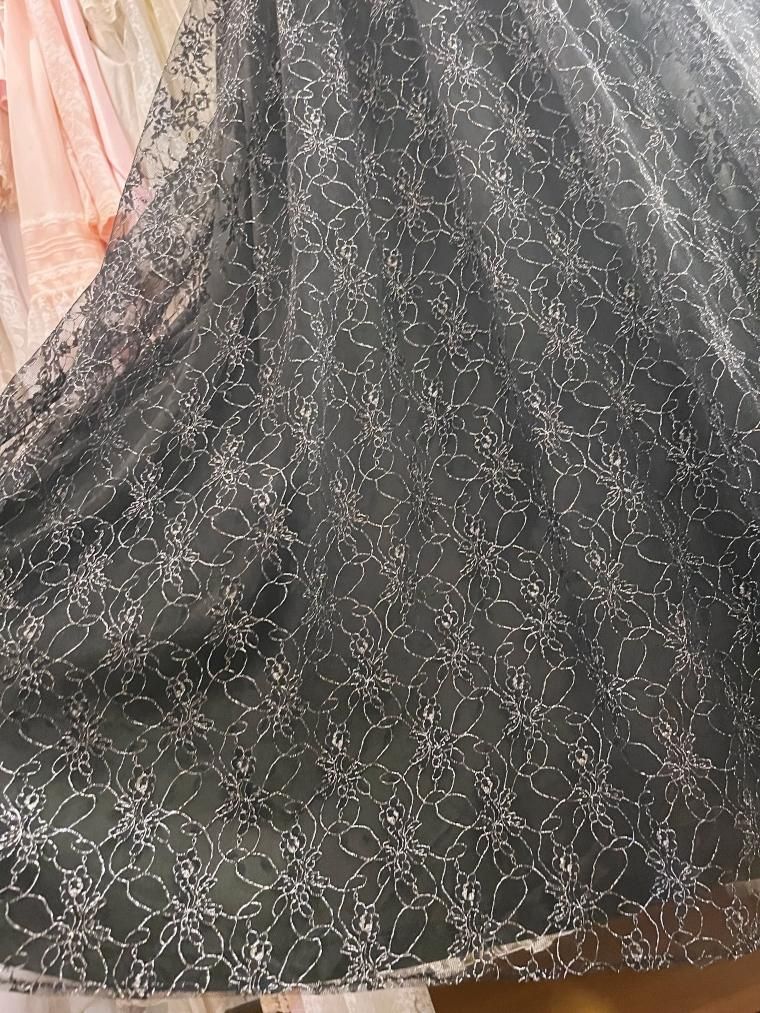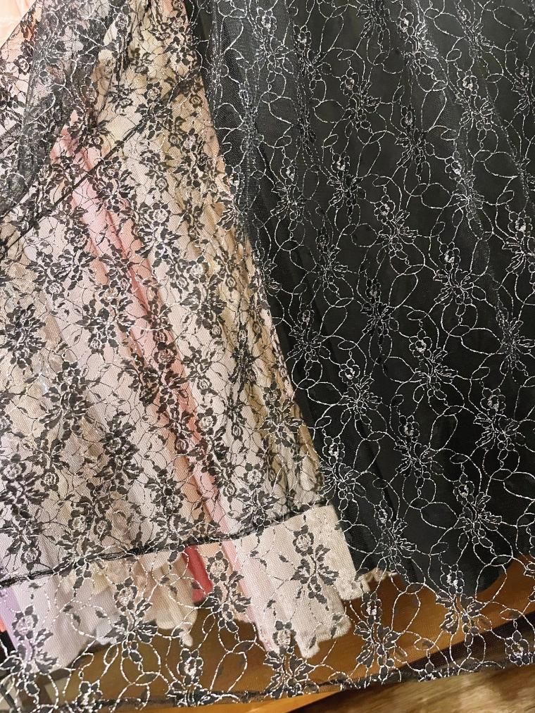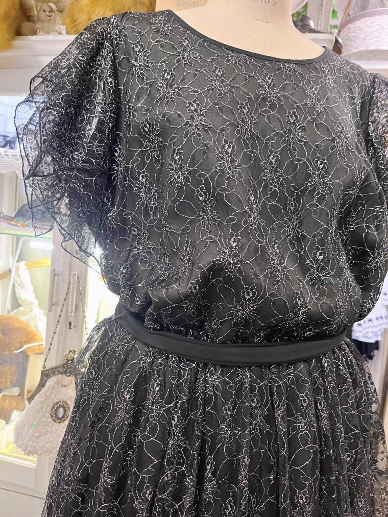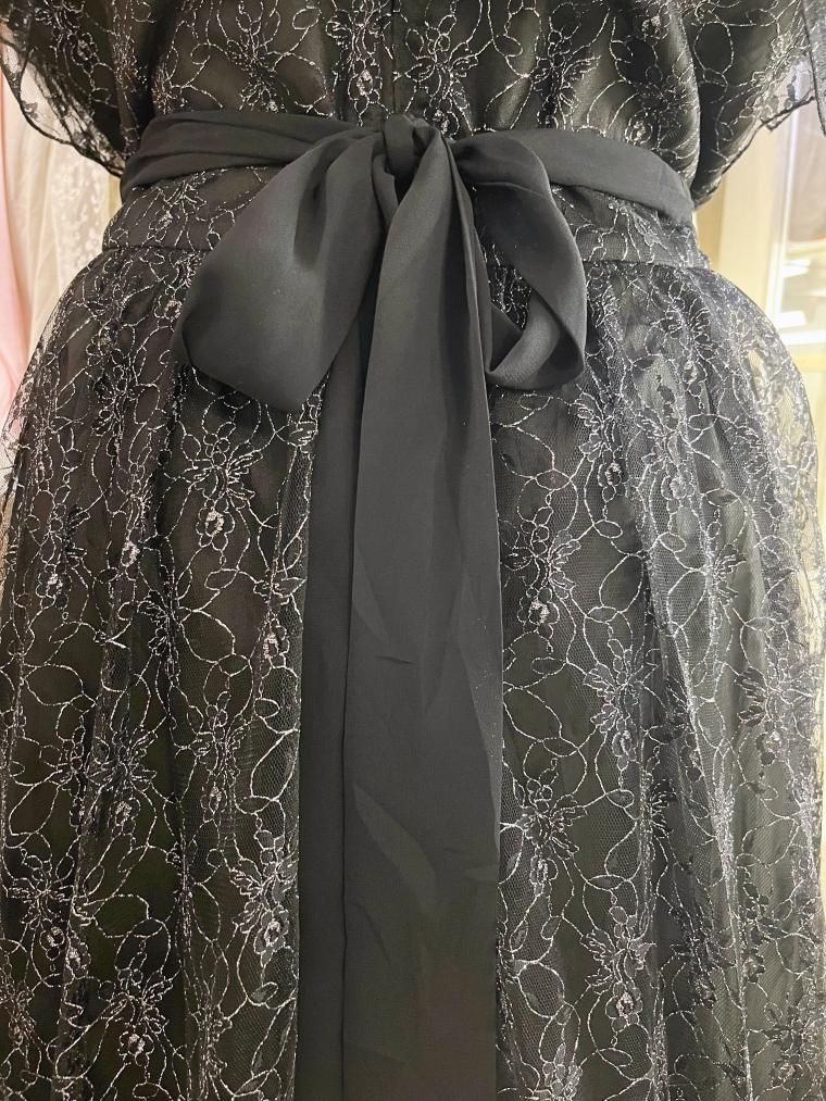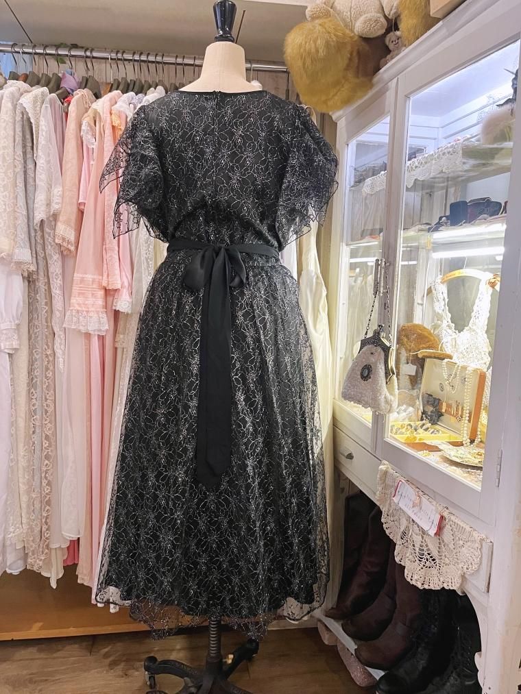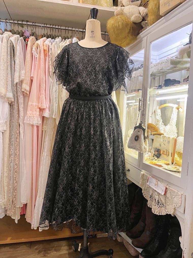 総レースフレアスリーブラメ入りブラックワンピース 25424