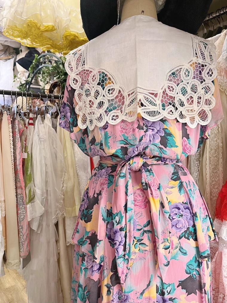 vintage U.S.A. ホワイトカラーリボン付きフローラルブラックワンピース