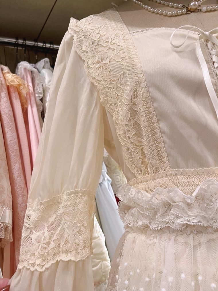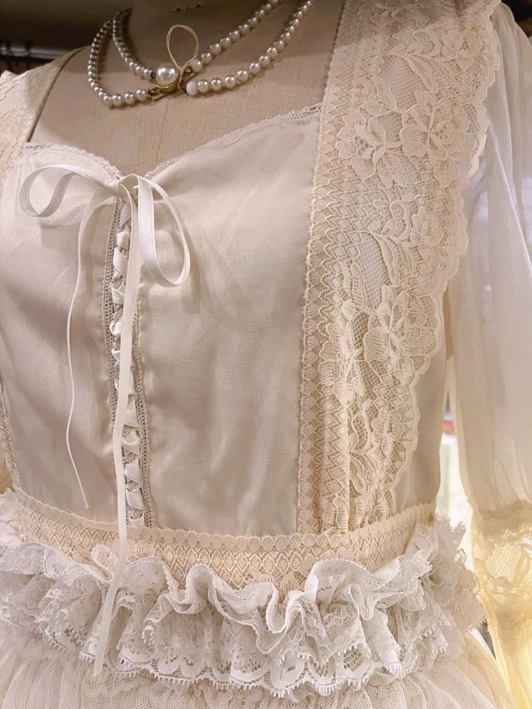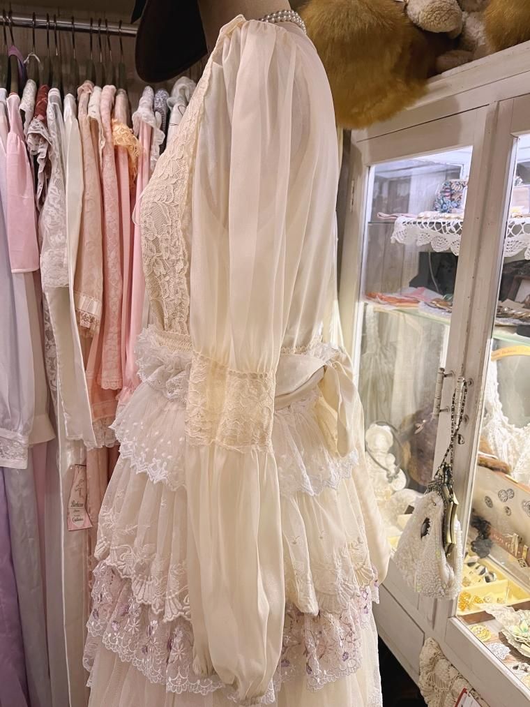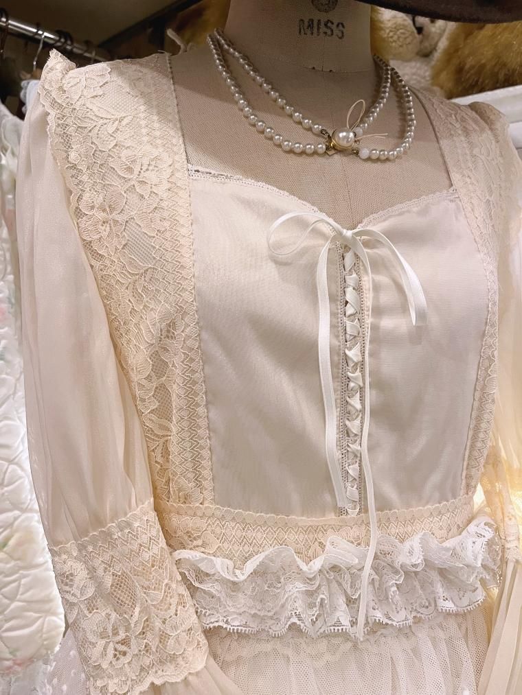 vintage nightie 60s リボンレースロマンチックロングガウン オフホワイト