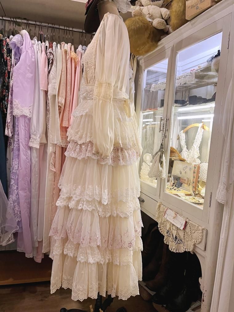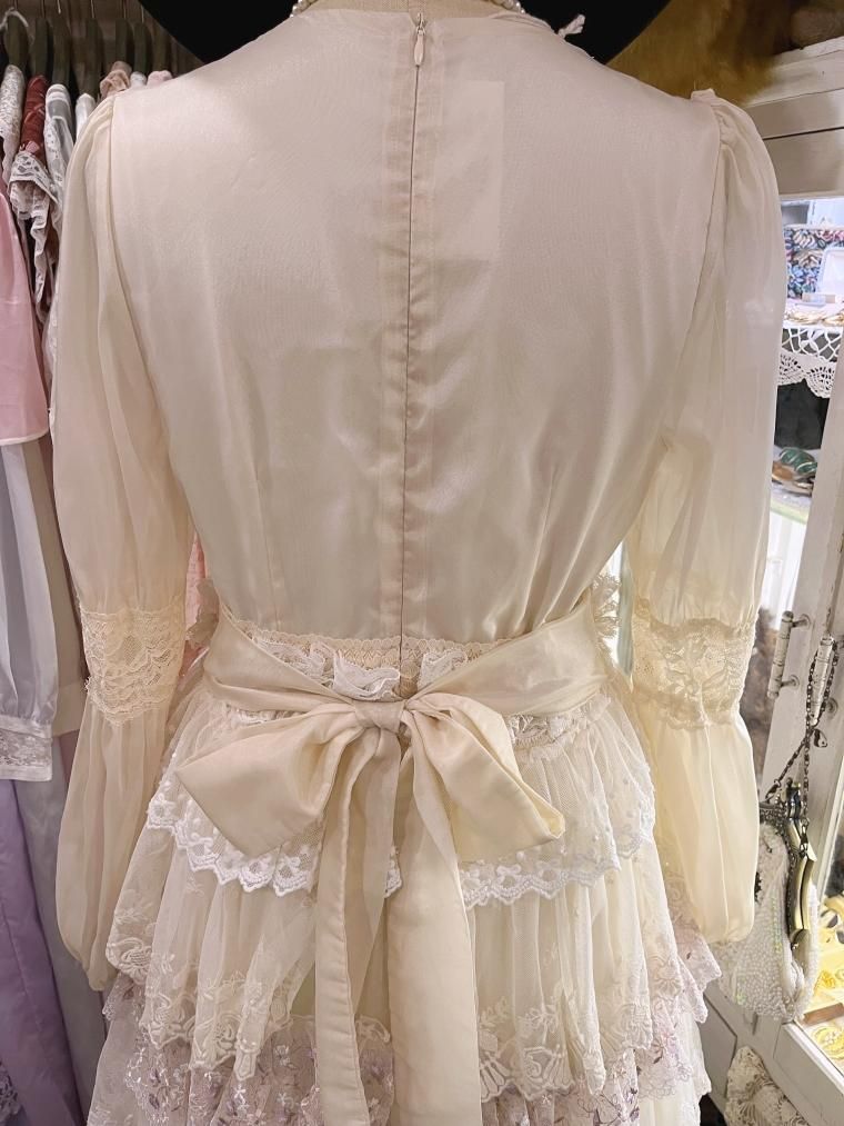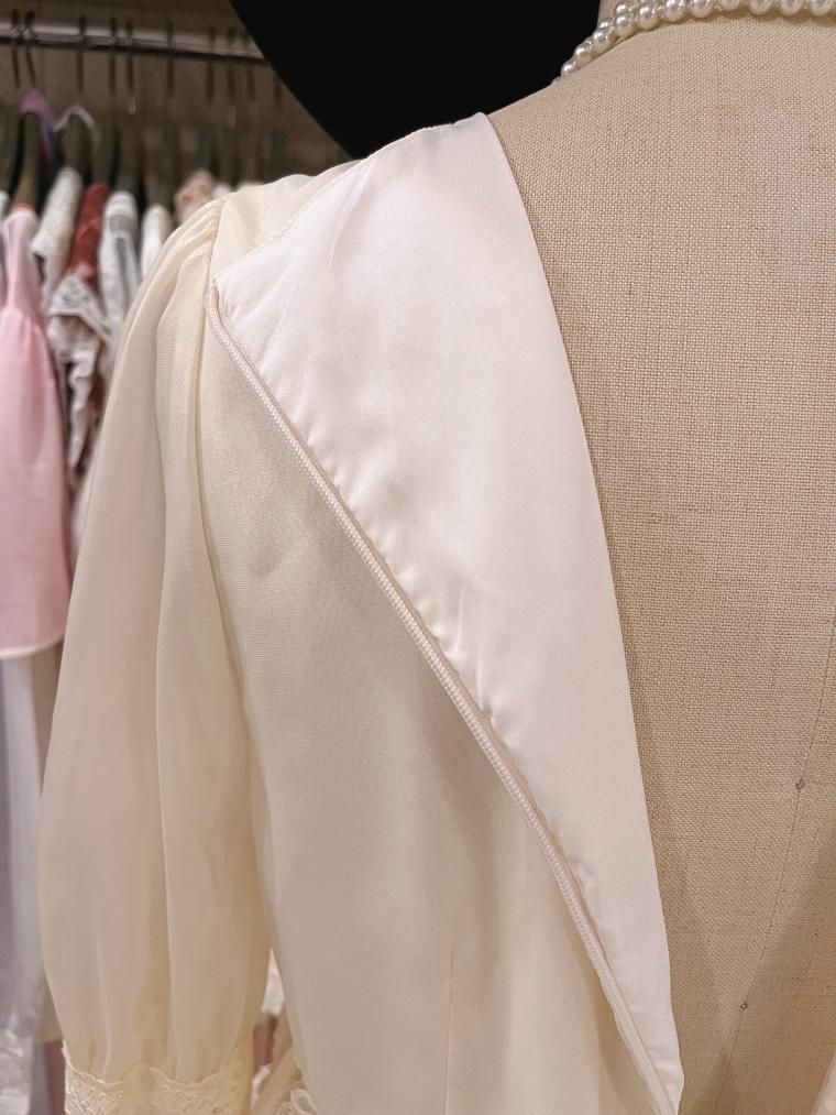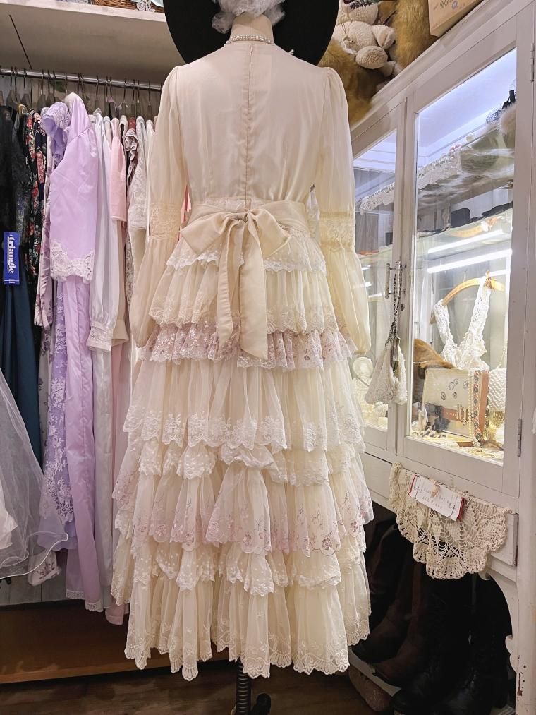 vintage nightie 60s リボンレースロマンチックロングガウン オフホワイト