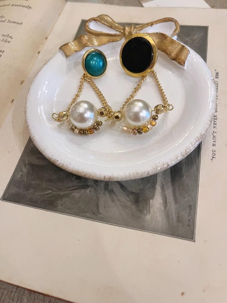 キャッチにチェーンとパールが装飾されたデザインとなっています。