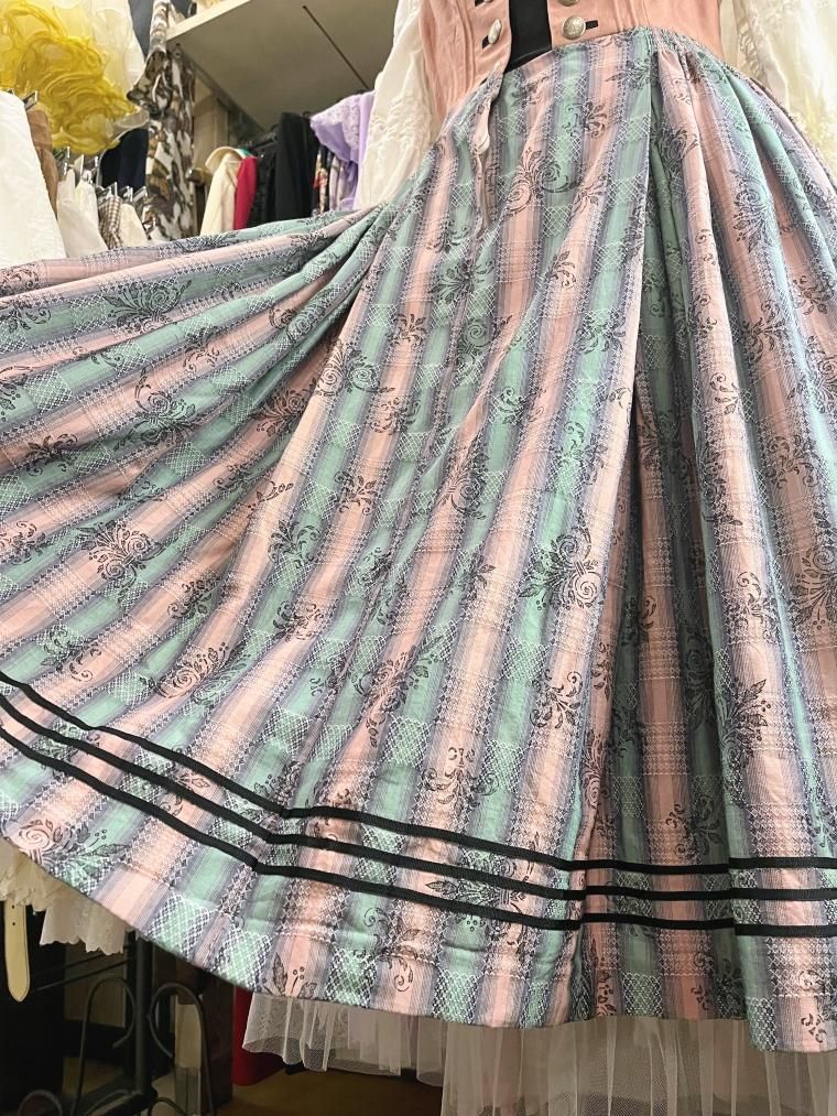 コットンレースレイヤードストライプフレアチロルスカート