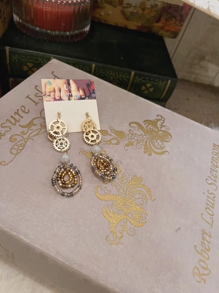 歯車モチーフと渦巻きビーズでデザインされた