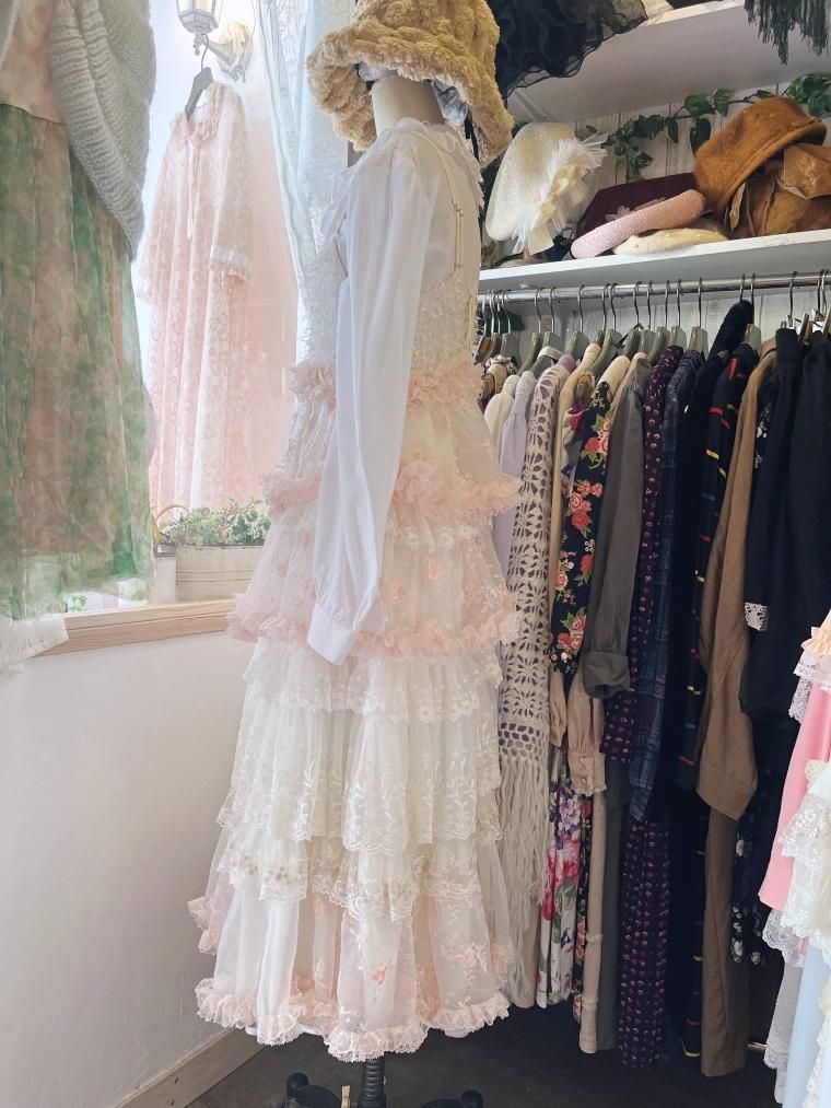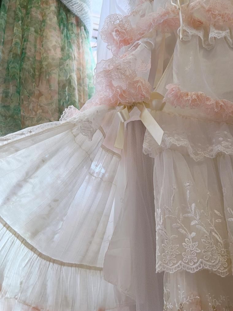 vintage nightie 60s リボンレースロマンチックロングガウン オフホワイト