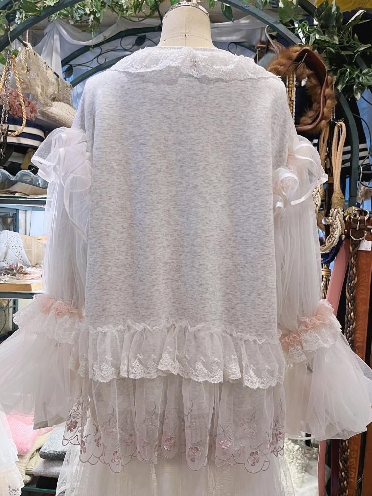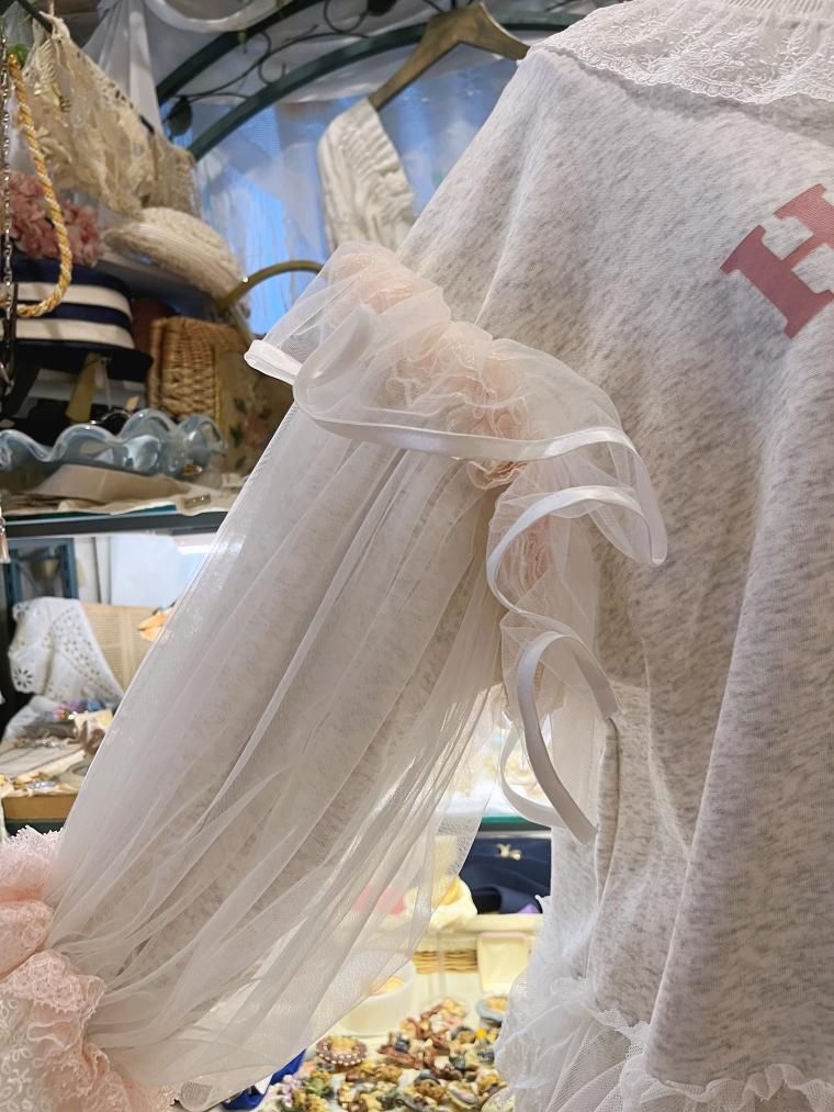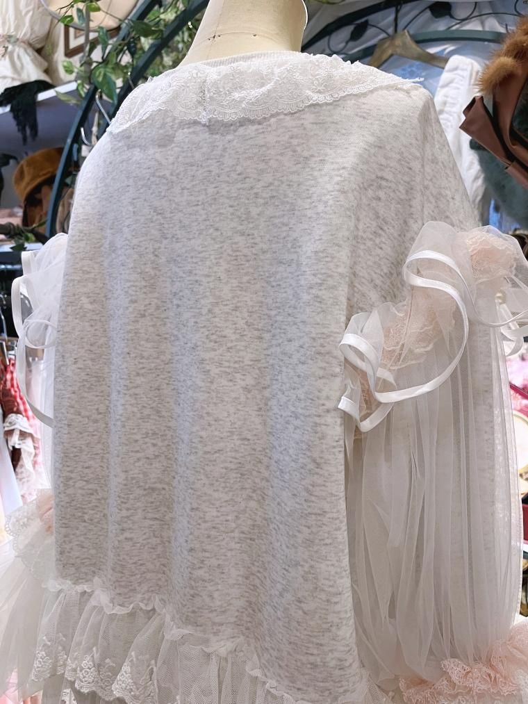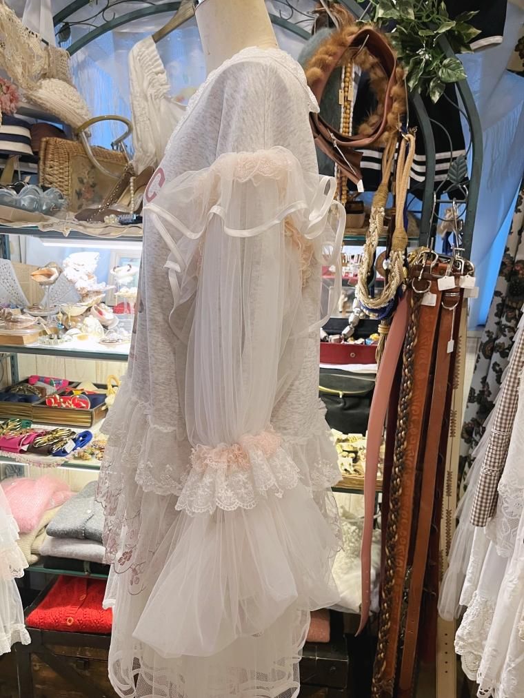 ふわふわのスリーブと裾のレースがガーリーな一着です。